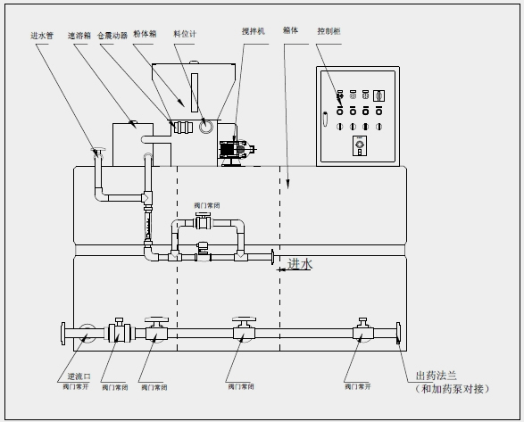 1、自動(dòng)化程度高、操作簡(jiǎn)單方便; 2、系統(tǒng)穩(wěn)定可靠,有故障時(shí)相關(guān)設(shè)備會(huì)自動(dòng)按要求停止,同時(shí)發(fā)出報(bào)警信號(hào); 3、采用螺旋給料器投加粉體,可手動(dòng)調(diào)速,保證投料均勻、分散、精度高; 4、在規(guī)定的生產(chǎn)量及連續(xù)投液條件下,其配置濃度為0.1%-0.5%; 5、干粉不足、藥液不足時(shí)均能發(fā)出報(bào)警信號(hào); 6、采用微型振動(dòng)馬達(dá)防干粉倉(cāng)內(nèi)架橋; 7、預(yù)混器加速粉料的水化作用。