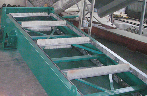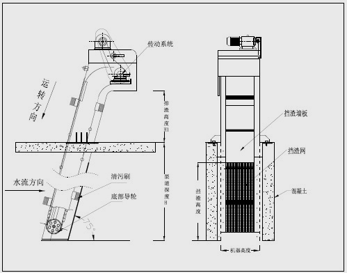WBF轉(zhuǎn)刷網(wǎng)蓖式格柵除污機主要由驅(qū)動裝置、機架、主軸、柵網(wǎng)、托渣板、固定板刷、回轉(zhuǎn)刷及牽引鏈組成。在電機驅(qū)動下,通過減速機減速后,帶動鏈輪與鏈條運動,固定在回轉(zhuǎn)鏈條上板刷沿柵網(wǎng)網(wǎng)面由下而上移動,清掃網(wǎng)面并帶走污物,污物運送至頂部時,大部分靠重力自行落至排渣都,少量附著在固定板刷上的污物被轉(zhuǎn)動的回轉(zhuǎn)刷清除掉,完成除污過程,液體則通過柵網(wǎng)的間隙流過,整個工作過程連續(xù)進行。